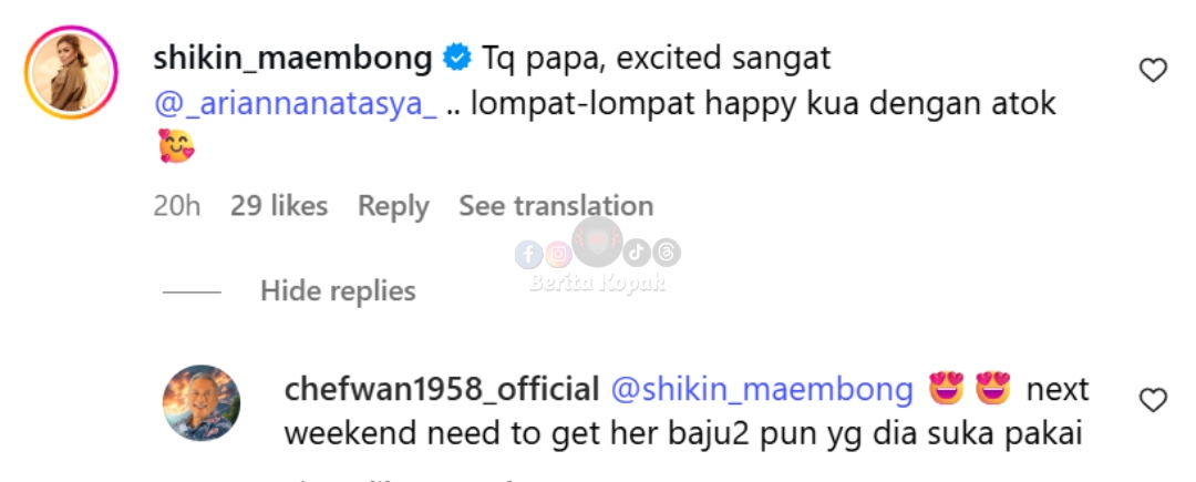 Shikin turut meninggalkan komen di posting Chef Wan :