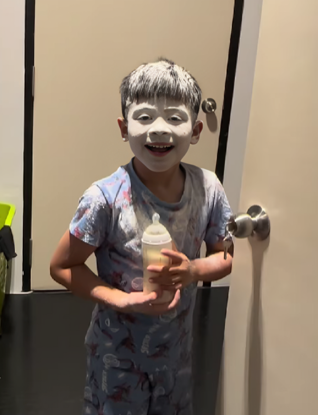 Bukan itu sahaja, Norreen turut sempat merakam secara diam-diam aksi Eshan yang sedang bermain bedak di dalam tandas. Kelihatan Eshan menyapu bedak ke seluruh wajahnya malah hingga ke bahagian kepala. Apabila menyedari dirinya dirakam, Eshan hanya memberikan senyuman polos yang menambahkan lagi kecomelan aksinya.