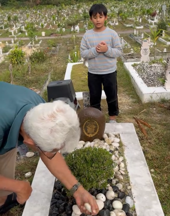 Selepas selesai membersihkan pusara, Matin berdiri di bahagian atas batu nisan Sarah dan membacakan doa. Hati warganet tersentuh dan ramai yang menangis ketika melihat Matin mengucup batu nisan ibunya itu. Pastinya Matin sangat merindui ibu.